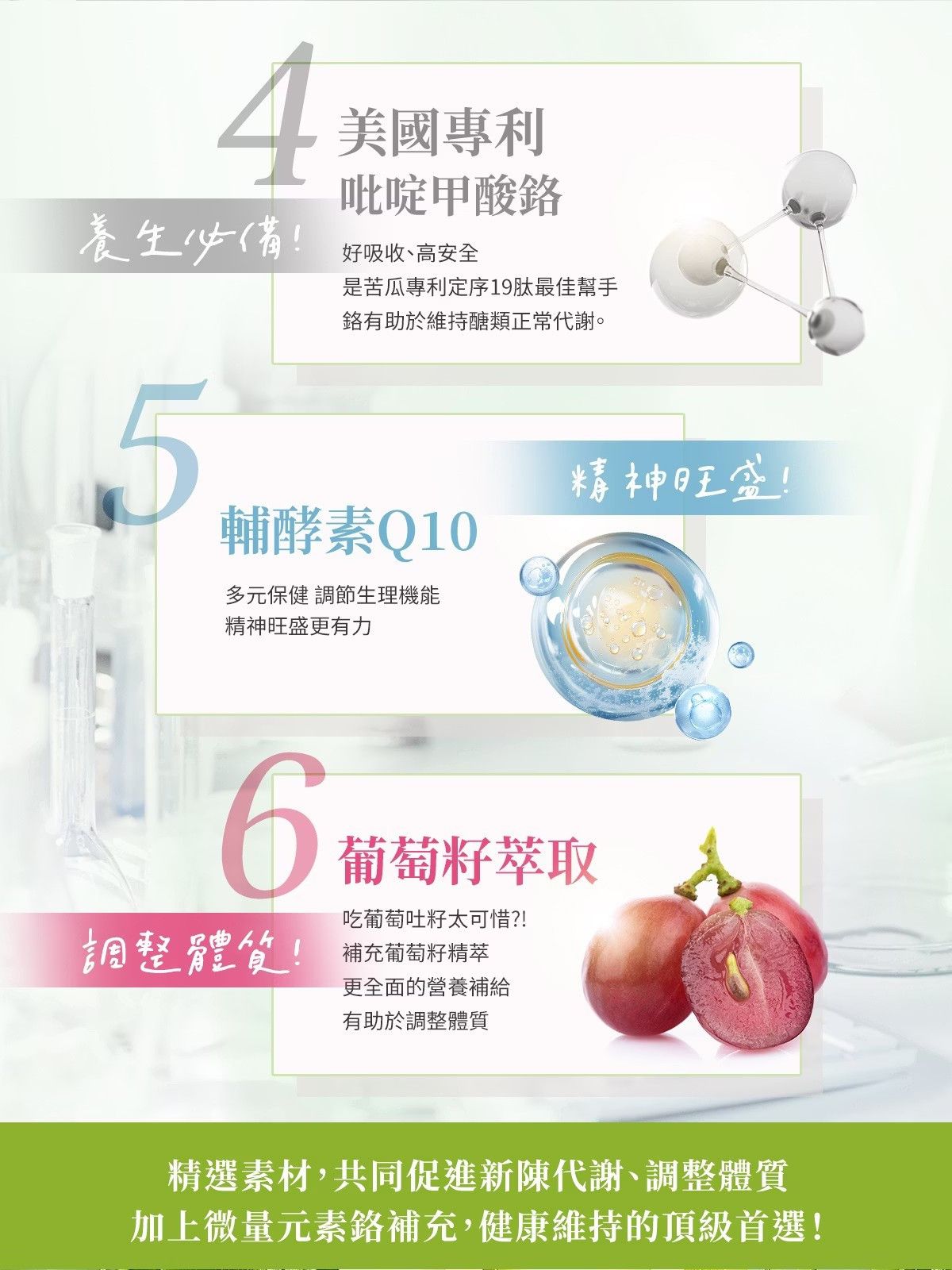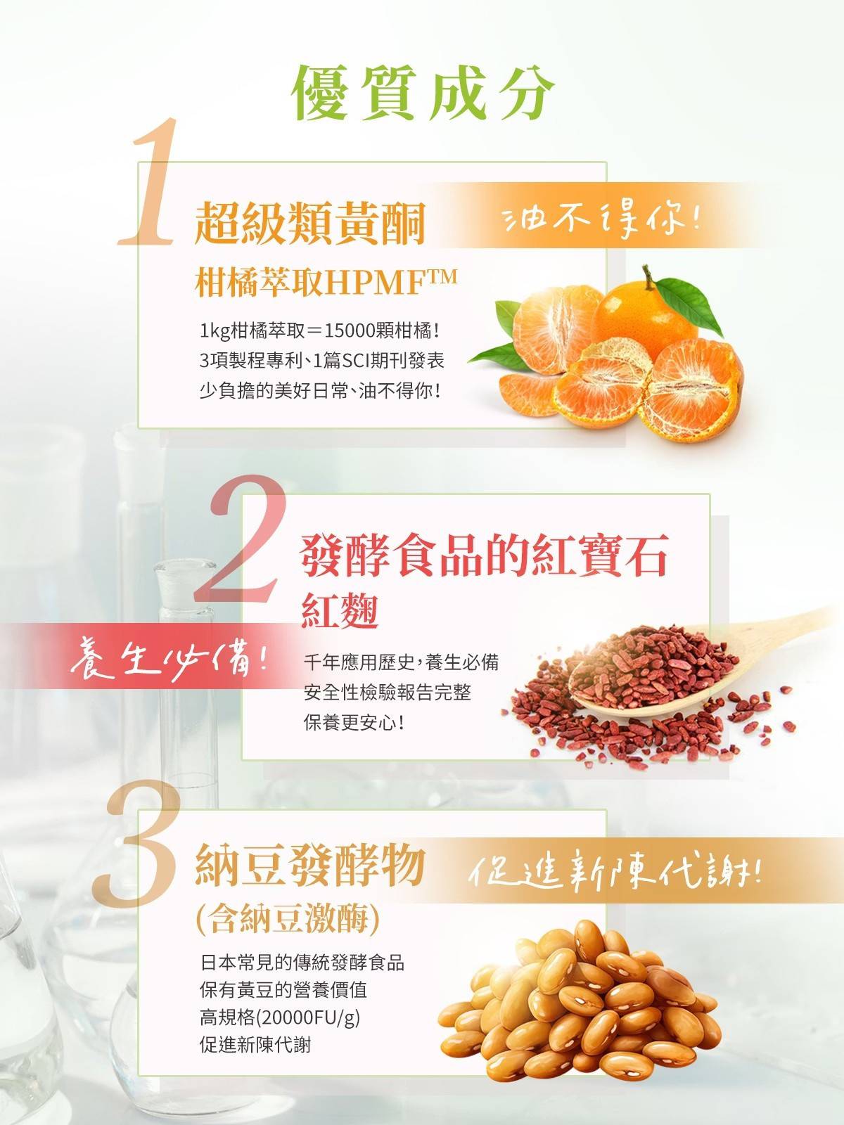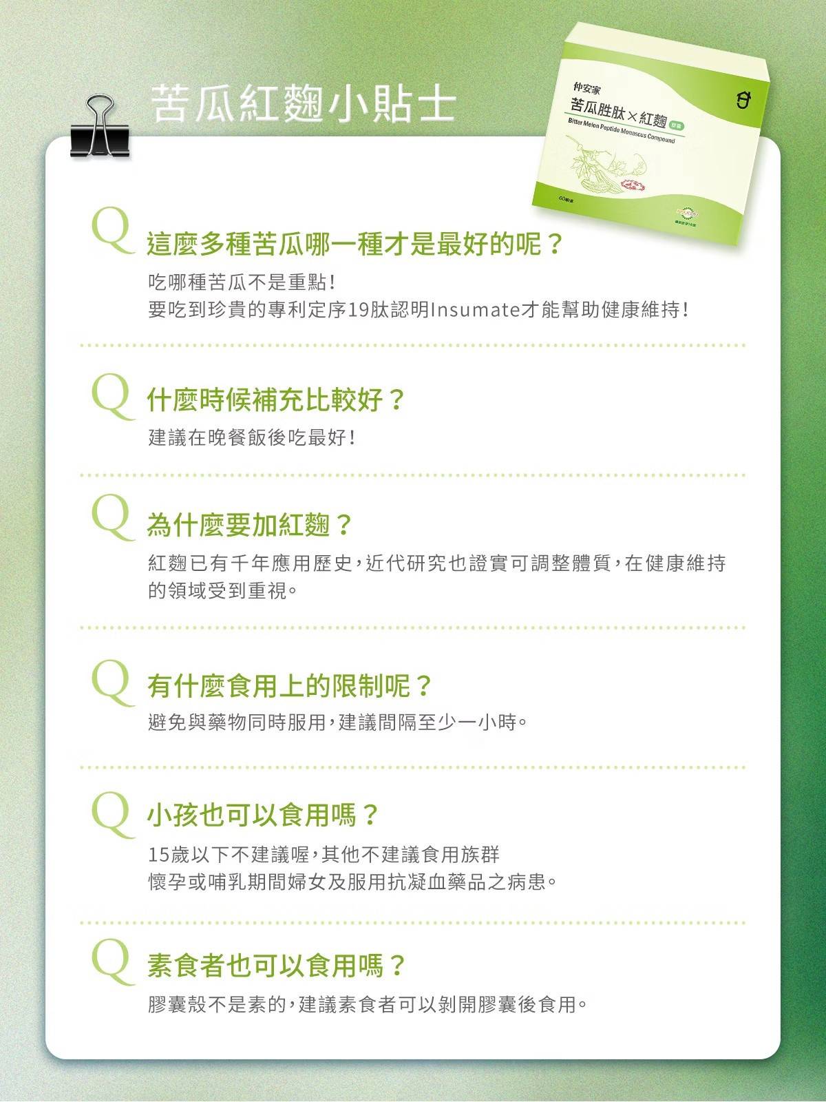 成分:Insumate®苦瓜萃取(含專利定序19肽)、柑橘萃取物(含HPMF™)(麥芽糊精、柑橘萃取粉)、紅麴(米、紅麴)、