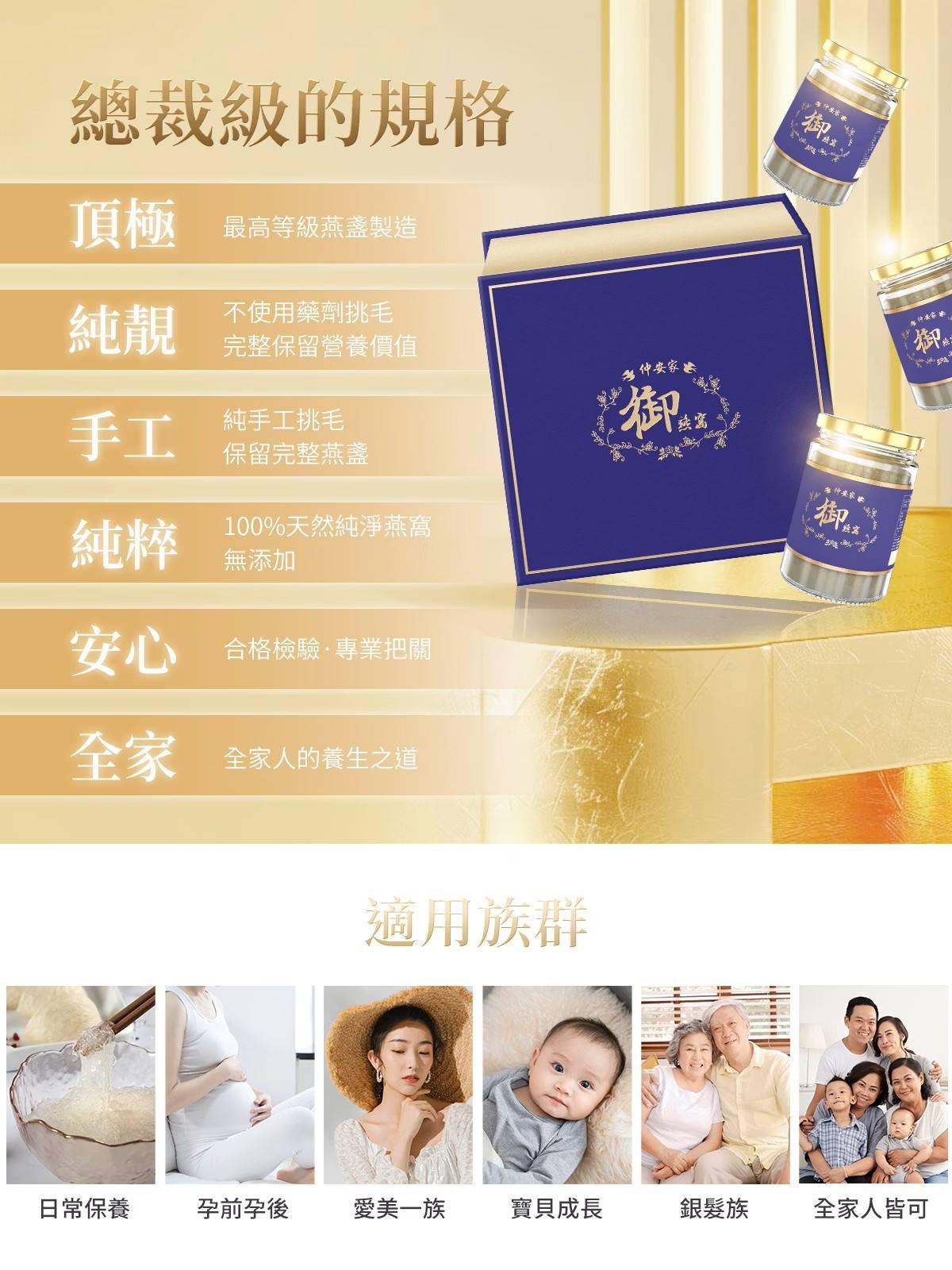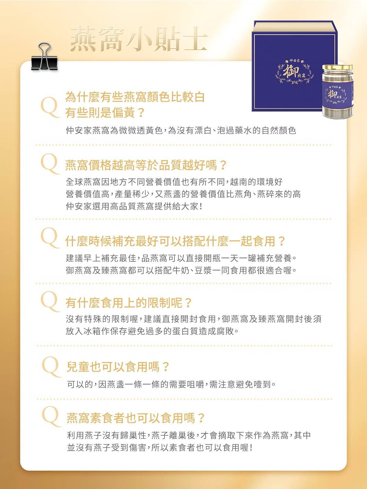 - 本產品含天然燕盞,有細微點狀物純屬正常現象,敬請安心食用。