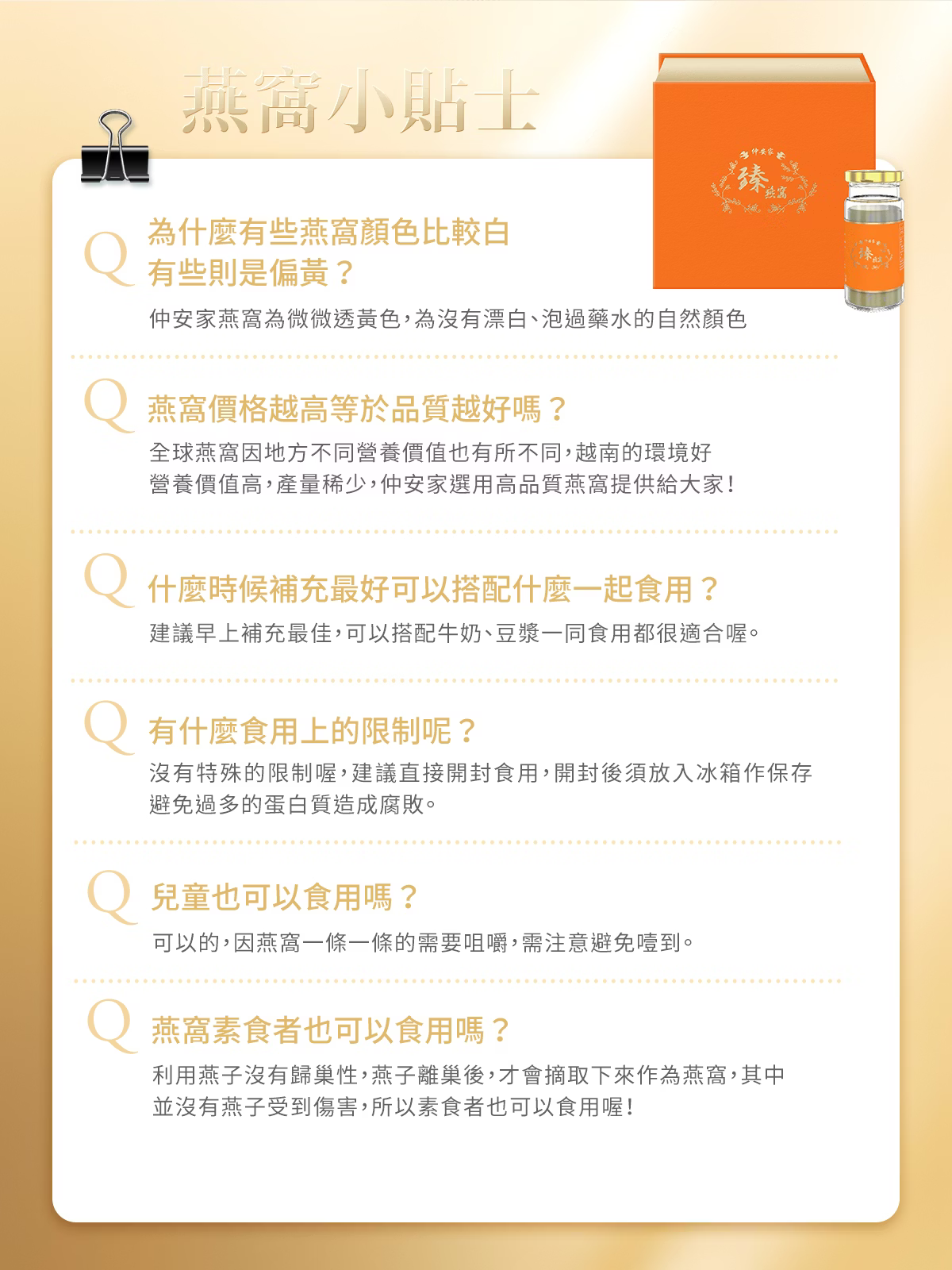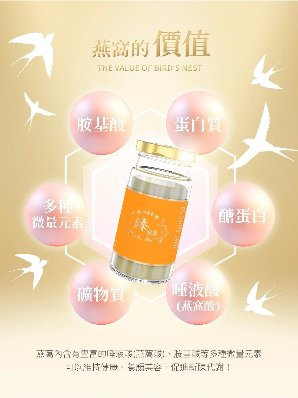 - 本產品含天然燕窩,有細微點狀物純屬正常現象,敬請安心食用。