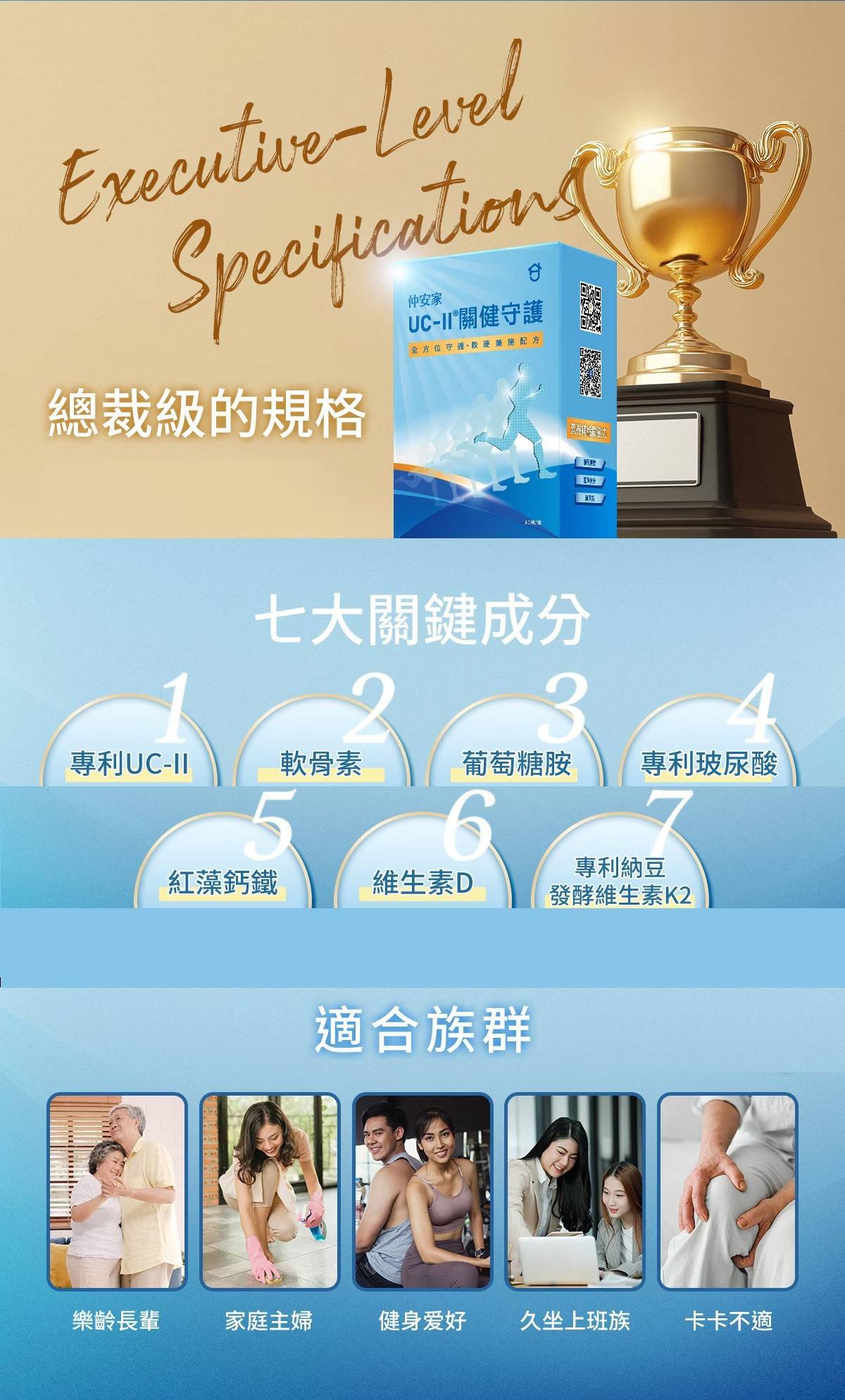 成分:紅藻粉(含海藻鈣)、葡萄糖胺鹽酸鹽、鯊魚軟骨粉、UC-II®專利膠原蛋白複合物(雞胸軟骨粉(含非變性二型膠原蛋白)、氯化鉀)、微結晶狀α-纖維素、流行鏈球菌發酵物(含透明質酸鈉)、二氧化矽、納豆菌萃取物(含維生素K2)(麥芽糊精、辛烯基丁二酸鈉澱粉、中鏈三酸甘油酯、納豆菌萃取物)、維生素D3(辛烯基丁二酸鈉澱粉、蔗糖、L-抗壞血酸鈉(抗氧化劑)、中鏈三酸甘油酯、二氧化矽、維生素E(抗氧化劑)、維生素D3)