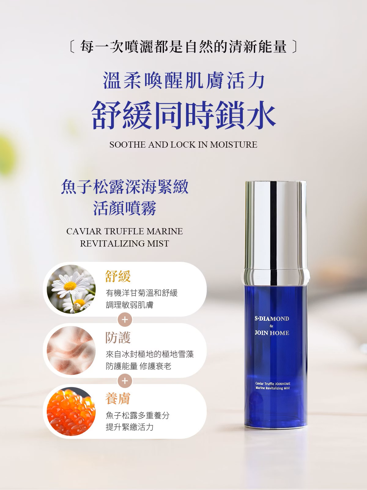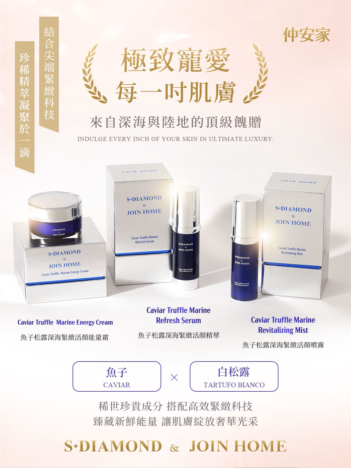 使用方式:用於S+DIAMOND & JOIN HOME魚子松露 仲安家 深海緊緻活顏精華之後使用,均勻塗抹於全臉,並加以按摩,早晚勻可使用。