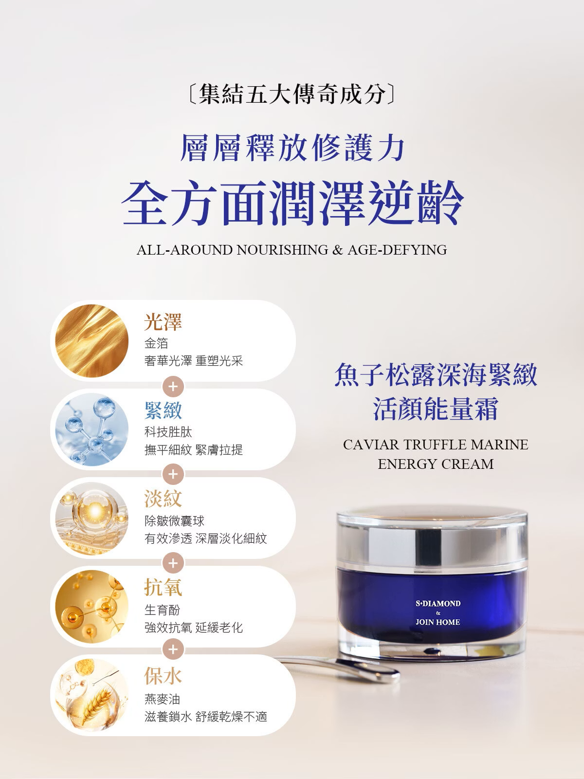 使用方式:用於S+DIAMOND & JOIN HOME魚子松露 仲安家 深海緊緻活顏精華之後使用,均勻塗抹於全臉,並加以按摩,早晚勻可使用。