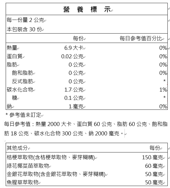 - 成分:麥芽糊精、玉米澱粉、桔梗萃取物(含桔梗萃取物、麥芽糊精)、阿拉伯膠、綠花椰菜苗萃取物、金銀花萃取物(含金銀花萃取物、麥芽糊精)、魚腥草萃取物、羅漢果萃取粉、杏仁濃縮粉(含杏仁、玉米澱粉、結晶性纖維素、硬脂酸鈣)、二氧化矽、枇杷葉萃取物(含枇杷葉萃取物、麥芽糊精)、黃耆萃取物(含黃耆萃取物、麥芽糊精)、薄荷萃取物、茯苓萃取物(含茯苓萃取物、麥芽糊精)。